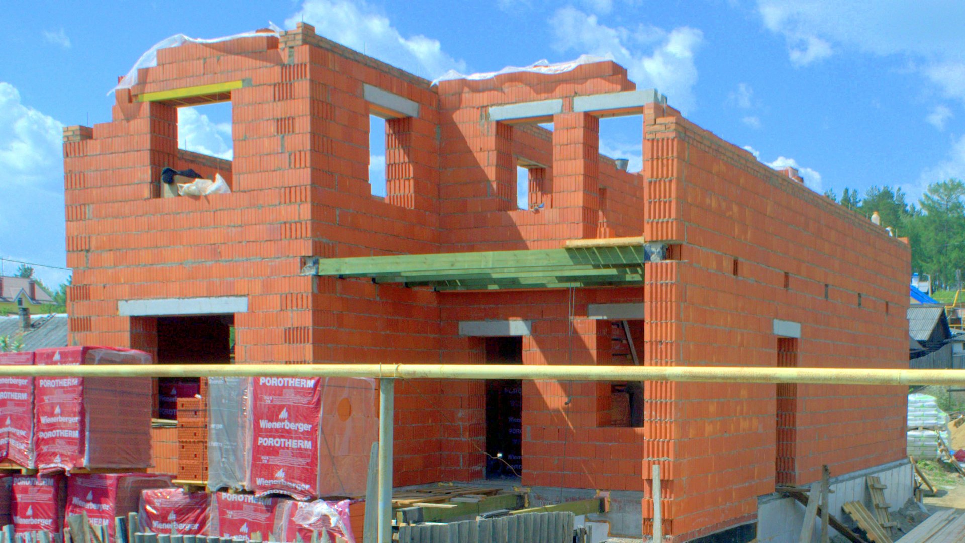В феврале завез весь блок. Если не ошибаюсь, около 120 кубов. Или 6 фур по 18 палет. Стены из Поротерм-51 и 38. Коробка 11м х 13м, начали собирать в конце апреля. Завершили к середине мая. Всех затрат получилось 1190000руб. Из них, только блок стоил около 800тр. Собирали на теплую кладочную смесь на основе перлита. Мешали смесь сами. Перемычки ж/б заводские. Плиты перекрытия ж/б заводские.