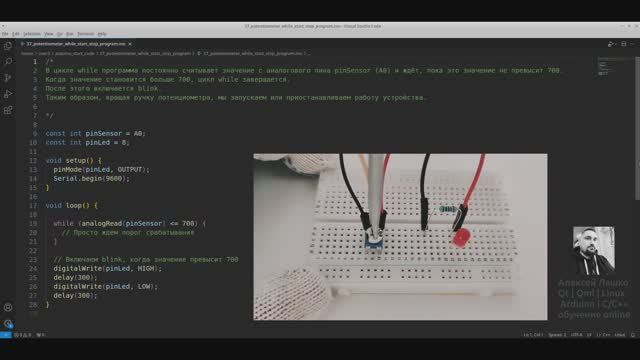 Rutube задача: https://rutube.ru/video/6ed5a3d8b34976472573c7351aec3ea9/ 37. Включение / приостановка работы программы. Используйте потенциометр. В цикле while программа постоянно считывает значение с аналогового пина pinSensor (A0) и ждёт, пока это значение не превысит 700. Когда значение становится больше 700, цикл while завершается. После этого включается blink. Таким образом, вращая ручку потенциометра, мы запускаем или приостанавливаем работу устройства. 37_potentiometer_while_start_stop_program Весь код "Arduino Starter Kit задачи для начинающих (Набор Ардуино)" с задачами и ответами: https://gitflic.ru/project/lashko_ag/arduino-starter-kit-zadachi-dlya-nachinaushchih-nabor-arduino Telegram-группа: https://t.me/arduino_starter_kit Rutube плейлист Arduino Starter Kit: задачи для начинающих (Набор Ардуино): https://studio.rutube.ru/playlist/1196693 Rutube плейлист Arduino Starter Kit: ответы на задачи (Набор Ардуино): https://studio.rutube.ru/playlist/1196692 #Arduino #StarterKit #НаборАрдуино #ОбучениеArduino #Программирование #ОбучениеПрограммированию #КурсыArduino #ПрограммированиеДляНачинающих #lashko #АлексейЛашко