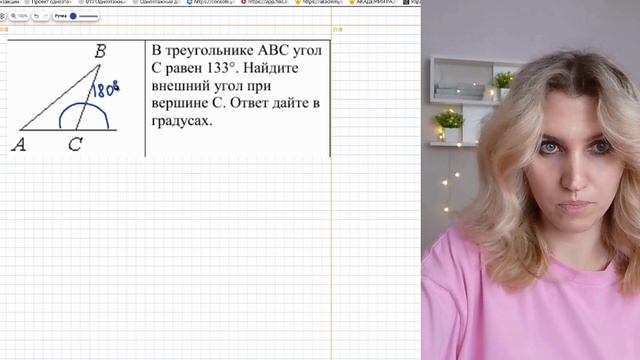 В треугольнике ABC угол C равен 133°. Найдите внешний угол при вершине C. Ответ дайте в градусах. ТГК https://t.me/laranam ВК https://vk.com/laraname ОК https://ok.ru/group/70000033283777 #репетиторматематика #огэ #репетиторпоматематике #огэ #математика #репетитор