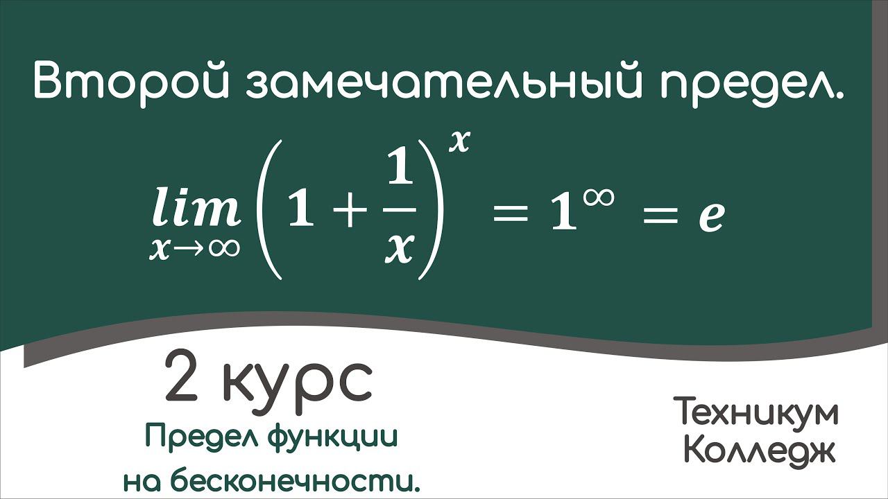 2 курс. Техникум, колледж. 10-11 класс. Второй замечательный предел. Неопределенность вида один в степени бесконечность. Примеры вычисления пределов функции с использованием второго замечательного предела. Пример вычисления предела функции, раскрытие неопределенности вида 1 в степени бесконечность. 00:00 Второй замечательный предел. 01:40 Пример 1. 02:40 Пример 2. 04:26 Пример 3. 06:09 Пример 4. 08:48 Пример 5. 11:43 Пример 6. Поддержать автора: https://yoomoney.ru/to/4100118156988006 Ссылка на мой Яндекс Дзен "Волкова Е.Н. Понятная математика. Техникум и колледж." - https://dzen.ru/video/watch/659fb922752c7409f19f3163
