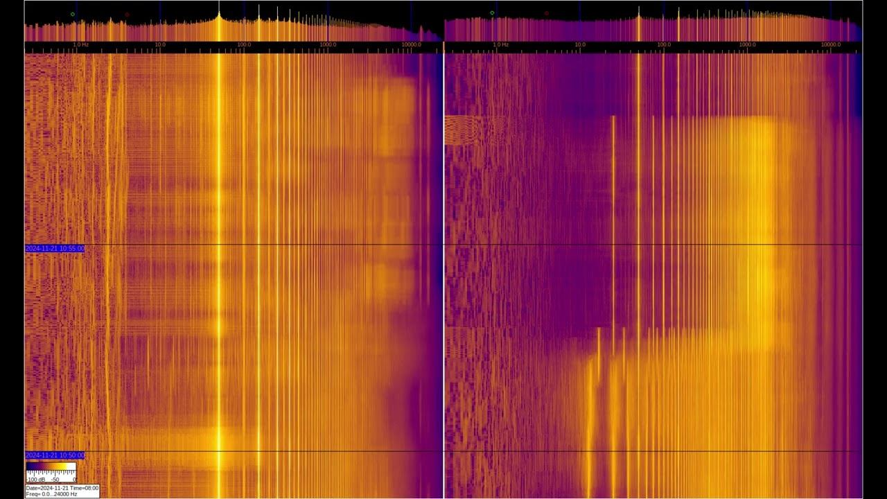 The left and right signals are taken from inductive sensors with ferromagnetic elements, but the left one is additionally connected to grounding on 2 stainless steel pins buried 1 m and spaced 1 m apart. You can see a large number of harmonics from the power supply and various artificial signals. Of interest are signals at frequencies below 50 Hz, where you can observe the operation of specialized equipment and communication signals of submarines and underground objects. Separately, it is worth considering signals in the region of 1-3 Hz on the left spectrum, which relate to the geomagnetic background, which is modulated by solar activity, They can be viewed in more detail in the video called “Signals from the Earth,” which are in the playlists below. The sound in the video is recorded in real time - a signal from sensors. О ПРОИСХОЖДЕНИИ ЧАСТОТНОЙ МОДУЛЯЦИИ СЕРПЕНТИННОЙ ЭМИССИИ https://youtu.be/bwWHggY1IVU?si=xAX1diRKI9MxQJ88&t=1740 Previous monitoring is in playlists: EMF monitor https://youtube.com/playlist?list=PLiRg2YCbXcwn41BHqADKVBep_TgVq6XUN Очень Низкая Частота ~ Very Low Frequency https://youtube.com/playlist?list=PLiRg2YCbXcwnp5DxM4PnSs7k_Rnypaqek SIGNALS IN THE GROUND https://youtube.com/playlist?list=PLiRg2YCbXcwl6f3Bf5arHbGSOCNE5U71O поддержать канал: 8-999-654-93-44