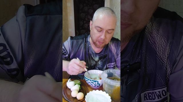 Куриная грудка с кетчупом, яйца варёные и солёные огурцы. Мукбанг, еда на камеру.