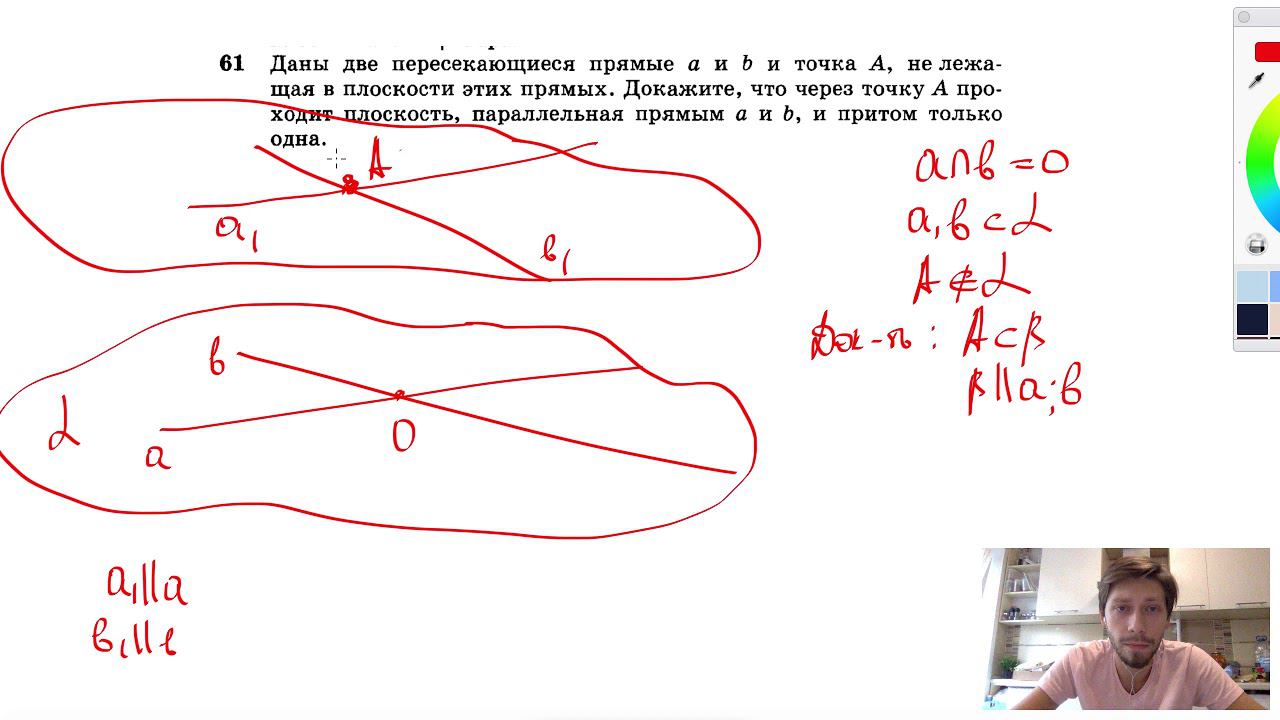 №61. Даны пересекающиеся прямые а и b и точка А, не лежащая в плоскости этих прямых. Докажите, что через точку А проходит плоскость, параллельная прямым a и b, и притом только одна. Поддержать канал рублём - 5469400944002125 (Сбербанк) Мой второй канал для подготовки к ЕГЭ и ОГЭ - https://www.youtube.com/ЕвгенийСумин Инстаграм - https://www.instagram.com/EGE_OGE.math Личный инстаграм - https://www.instagram.com/ee_sumin VK - https://vk.com/evgeniysumin FB - https://www.facebook.com/EvgeniySumin