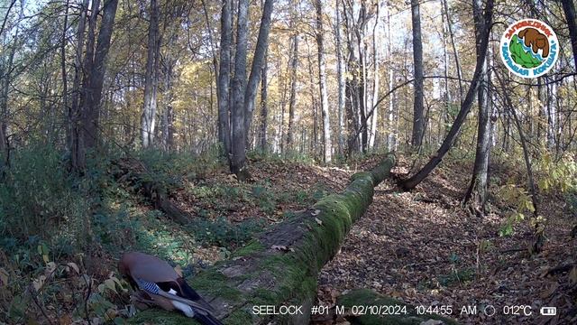 02.10.2024. Сойка. Заповедник "Большая Кокшага". Сидит на поваленном дереве и ест круглый плод (во