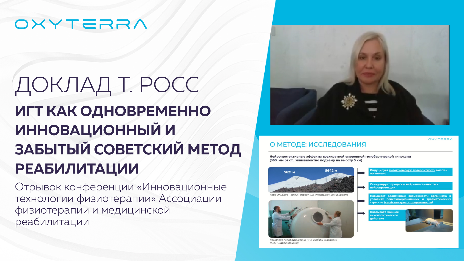 28 марта в 15:00 состоялся научный вебинар «Инновационные технологии физиотерапии» Ассоциации физиотерапии и медицинской реабилитации. На нем наш генеральный директор, Росс Татьяна, представила доклад «Гипокси-гипероксическая тренировка — одновременно инновационный и забытый советский метод реабилитации». Она рассказала не только про историю метода гипокситерапии, но и про актуальные клинические кейсы с гипокси-гиперокси терапией на OXYTERRA. Координатором мероприятия была Вера Васильевна Кирьянова*, Президент Ассоциации физиотерапии и медицинской реабилитации. *Кирьянова Веры Васильевна – известный физиотерапевт, профессор кафедры физической и реабилитационной медицины, заведующая Научно-исследовательской лабораторией высоких лазерных и магнитных технологий Северо-Западного государственного медицинского университета им. И.И. Мечникова, автор более 700 научных публикаций, в том числе 35 учебных пособий, 15 методических рекомендаций и 201 журнальной статьи. ====================================================== Больше методической литературы и научных статей по методу интервальной гипокси-гипероксической тренировки на инновационном аппарате OXYTERRA направим вам по запросу на info@oxyterra.ru Официальный сайт производителя: oxyterra.ru #oxyterra #окситерра #гипокситерапия #гипоксигиперокси #ггт #игт #медицинскоеоборудование #здоровье #физиотерапия #реабилитация #восстановление