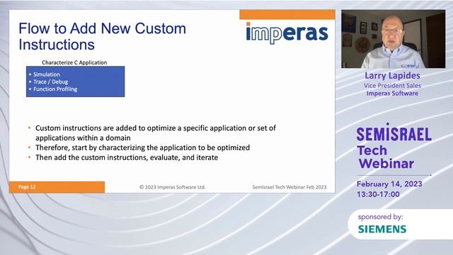 The design freedoms of RISC-V offer systems and SoC developers new flexibility to optimize a processor for the requirements of the target application. Now Architectural Exploration is not just about the configuration of multi-core designs, but the analysis of the application and potential advantages of custom instructions. Custom extension can boost the performance for a target class of operations, or support new multi-core communication methods. Software development with virtual prototypes is well established, but new to RISC-V is the advantage of these platforms offer to end users migrating legacy applications to the new RISC-V based device, well before silicon is available. For SoC teams optimizing a RISC-V processor they also need to address the additional challenge of RISC-V verification, open standards such as RVVI (RISC-V Verification Interface) are helping the ecosystem support for standards-based test benches and Verification IP. This talk highlights the RISC-V models that are unifying the hardware, software, and verification teams across all phases of RISC-V projects with dependable quality and efficiency. BIO: Prior to joining Imperas, Larry ran sales at Averant and Calypto Design Systems. He was vice president of worldwide sales during the run-up to Verisity's IPO (the top performing IPO of 2001), and afterwards as Verisity solidified its position as the fifth largest EDA company. Before Verisity and SureFire Verification (acquired by Verisity), Larry held positions in sales and marketing for Exemplar Logic and Mentor Graphics. Larry was recently an Entrepreneur-in-Residence at Clark University's Graduate School of Management, where he developed and taught a course on Entrepreneurial Communication and Influence. Larry holds an MBA from Clark University in addition to his MS Applied & Engineering Physics from Cornell University and BA Physics from the University of California Berkeley.