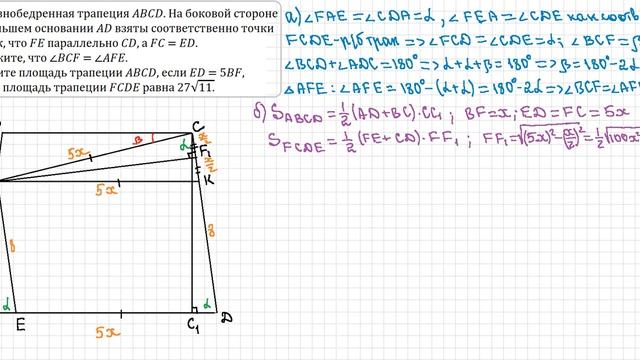 Дана равнобедренная трапеция . На боковой стороне и большем основании взяты соответственно точки и так, что параллельно , а = . а) Докажите, что ∠ = ∠. б) Найдите площадь трапеции , если = 5, = 8 и площадь трапеции равна 27√11.