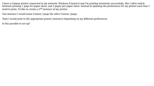 Creating 2 instances of the same printer in Windows 8 Helpful? Please support me on Patreon: https://www.patreon.com/roelvandepaar With thanks & praise to God, and with thanks to the many people who have made this project possible! | Content (except music & images) licensed under CC BY-SA https://meta.stackexchange.com/help/licensing | Music: https://www.bensound.com/licensing | Images: https://stocksnap.io/license & others | With thanks to user user2398188 (superuser.com/users/418383), user Hennes (superuser.com/users/121352), user Canadian Luke (superuser.com/users/24010), and the Stack Exchange Network (superuser.com/questions/934357). Trademarks are property of their respective owners. Disclaimer: All information is provided "AS IS" without warranty of any kind. You are responsible for your own actions. Please contact me if anything is amiss at Roel D.OT VandePaar A.T gmail.com
