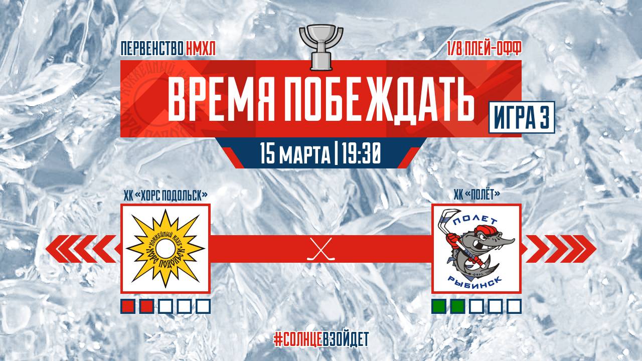 15 марта в 19:30 состоится третий матч в серии ХК «Хорс Подольск» против ХК «Полёт» в рамках 1/8 финала Кубка Регионов. Счет в серии 2:0 в пользу команды из Рыбинска, но у ХК «Хорс Подольск» есть дополнительный стимул перевернуть ход событий - поддержка домашней арены. Смотрите прямую трансляцию, следите в социальных сетях и болейте за ХК «Хорс Подольск».