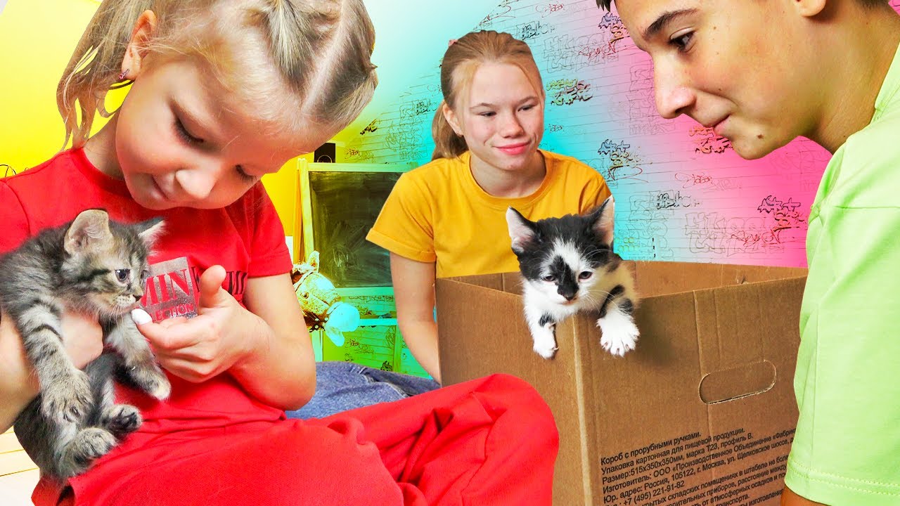 Младшая сестра и старший брат кормят котят – они стали выбираться из коробки. Старшая сестра приносит кошачий домик для них. Котят вредничают и плохо ведут себя. Родители просят Сашу, Соню и Степу сделать объявления, чтобы раздать котят. #trimpl #брат_и_сестра