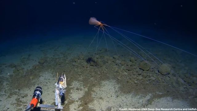 Подводный дрон, исследовавший Тихий океан, запечатлел необычного осьминога из рода Magnapinna на глубине 3,3 км. Неуловимое существо с очень длинными щупальцами до 8 метров в длину впервые было зафиксировано в 1907 году, и после этого с ним было задокументировано всего около 20 встреч. В желобе Тонга его обнаружили второй раз в истории.