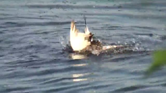 утка защищает свое потомство от чайки.