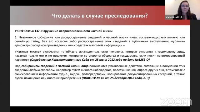 Валентина Фролова – адвокат, старший юрист практики семейного права «BGP Litigation». Более 10 лет представляет интересы пострадавших от домашнего насилия в российских судах, Конституционном Суде, Европейском Суде по правам человека и в Комитете ООН по ликвидации дискриминации в отношении женщин. Руководит юридической клиникой по защите от дискриминации в МГЮА им. О.Е. Кутафина. Вы узнаете: Как защитить пострадавших от насилия в семье? В каких случаях и куда обращаться? Как дела из России повлияли на практику Европейского Суда по вопросу защиты от домашнего насилия? Высказываются ли российские высшие суды о проблеме насилия в семье? Когда? 27.09 (понедельник) в 18.00