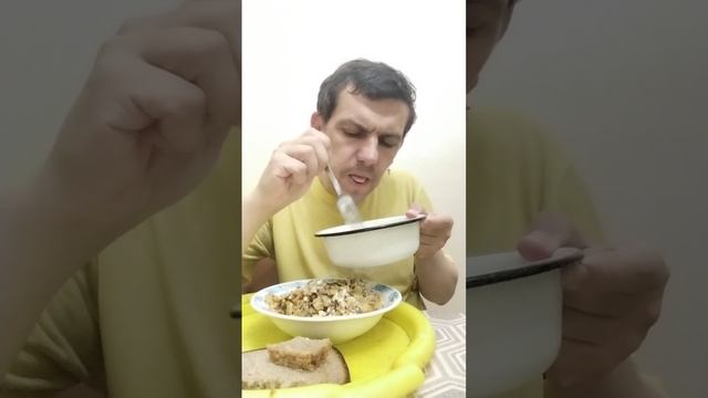 Обжор мукбанг жареная картошка с яйцами и тушёной свининой, овощной салат из огурцов и помидоров