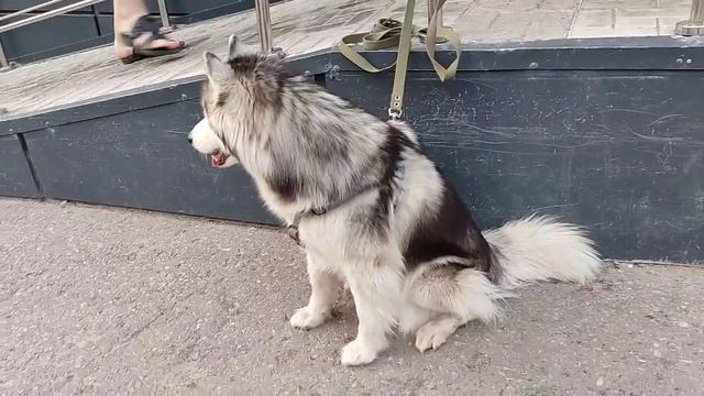 Большая, красивая собака у магазина ждёт свою хозяйку.