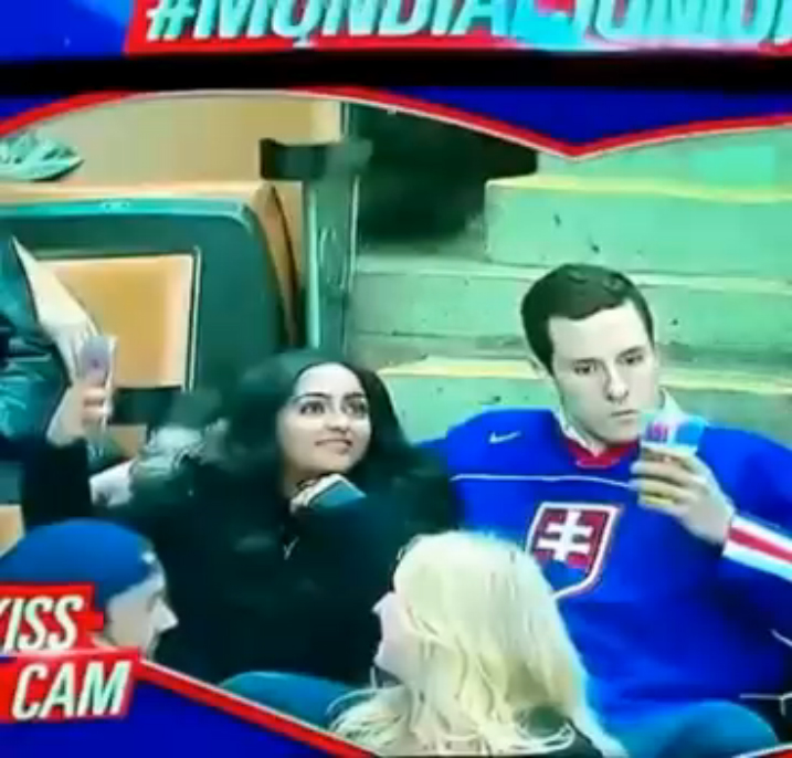 Болельщик сборной Словакии во время матча молодёжного чемпионата мира по хоккею поцеловал стакан с пивом вместо своей подруги, попав в объектив Kiss Cam.