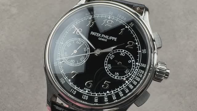 *перевести видео можно в Яндекс браузере Двухсекундный хронограф Patek Philippe Grand Complications (5370P-001) имеет 41-миллиметровый платиновый корпус с черным циферблатом grand feu, покрытым эмалью, и черный ремешок из кожи аллигатора с платиновой застежкой Calatrava Cross. Характеристики этого хронографа Patek Philippe Grand Complications с функцией разделения секунд включают в себя часы, минуты, малую секундную стрелку и хронограф с разделением секунд на доли секунды. Толщина этих часов Patek Philippe составляет 13,9 мм, а расстояние от выступа до выступа составляет 49,6 мм. Для получения более подробной информации ознакомьтесь с полным обзором хронографа Patek Philippe Grand Complications с функцией разделения секунд.