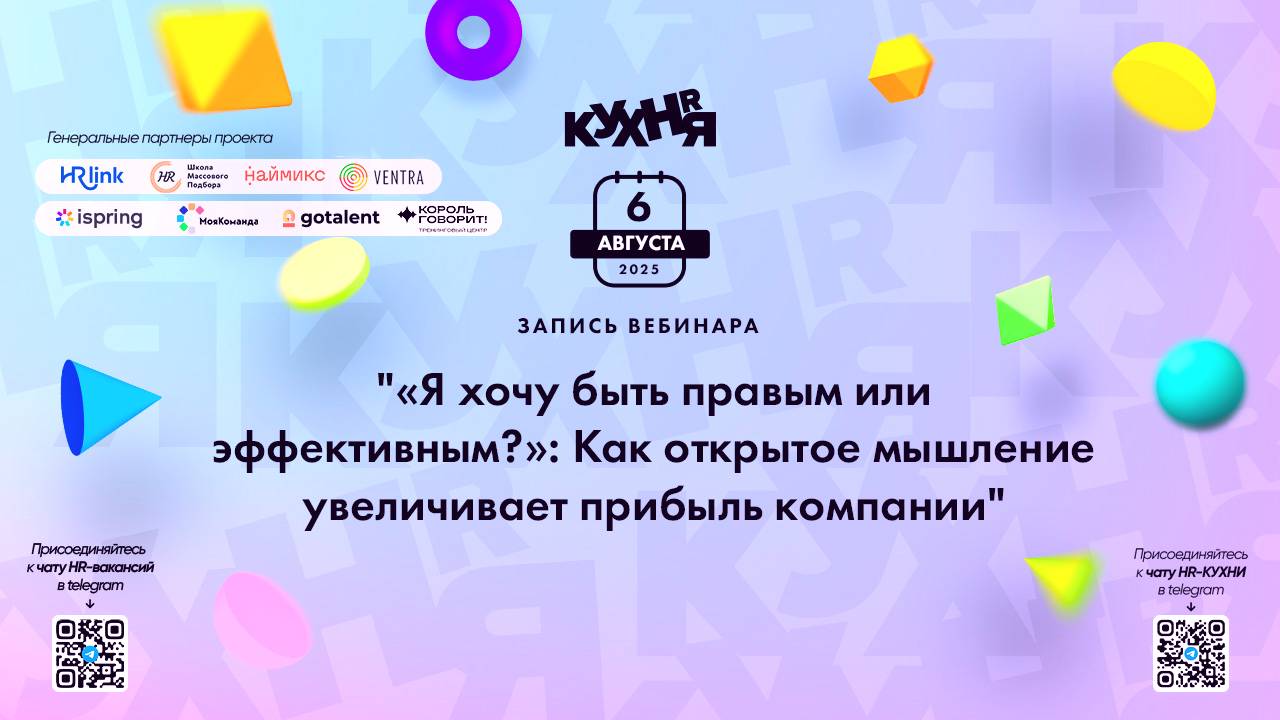 Присоединяйтесь к чатам и каналам HR-КУХНИ в телеграм: - Основной чат HR-КУХНИ в телеграм - https://t.me/+tYgAH0PgPQVkOWIy - Канал HR вакансий в телеграм - https://t.me/+CMNAN2u1hjo3M2Ri - Канал HR-EVENTS в телеграм - https://t.me/hr_kitchen - Канал HR JOURNAL в телеграм - https://t.me/hrkitchenjournal Полезные ссылки: - Каталог HR решений - https://hrkitchen.ru/exhibition - График конференций, бесплатных вебинаров, а также бесплатные курсы – https://hrkitchen.ru/ - Стать спикером HR-КУХНИ - https://hrkitchen.ru/speakers - Подписаться на полезную e-mail рассылку от HR-КУХНИ (новости, гайды, чек-листы, подарки от партнеров) - https://hrkitchen.ru/subscribe
