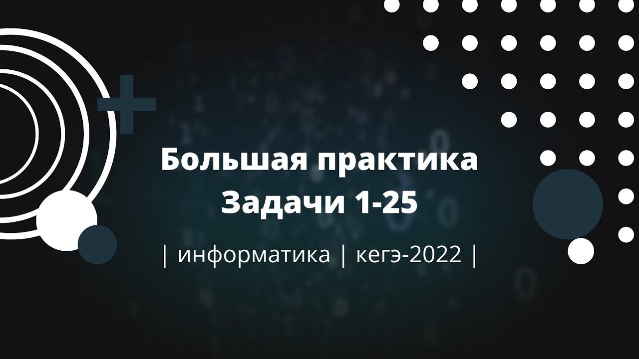 Сегодня мы вместе попрактикуемся решать ВСЕ задания из ЕГЭ по Информатике и разберем 200 задач (1-25) уровня сложности реального КЕГЭ! В видео мы в ускоренном темпе решили несколько сотен задач и вспомнили всё, что необходимо для ЕГЭ по Информатике 2022, чтобы сдать информатику на высокие баллы. Мои Бесплатные Курсы на Stepik : ➤ Python 3 - https://stepik.org/122809 ➤ "С Нуля до 40+ Баллов" - https://stepik.org/122795 Мои Платные Курсы на Stepik : ➤ Задания 1-23 - https://stepik.org/a/121057 ➤ Задание 24 - https://stepik.org/a/113430 ➤ Задание 25 - https://stepik.org/a/115478 ➤ Задание 26 - https://stepik.org/a/118263 ➤ Задание 27 - https://stepik.org/a/111154 ➤ Задания 1-27 - https://stepik.org/a/123226 ➤ Задания 24-27 - https://stepik.org/a/123227 Скидка на курсы 30% по промо-коду INFASOTKA Ссылки : ➤ Группа ВК - https://vk.com/shastin_ege ➤ Я в ВК - https://vk.com/leonid_shastin ➤ Gmail Почта - danilshayhmetov85@gmail.com ➤ Задачи из Видео - https://kompege.ru/variant?kim=25011650 ➤ Алексей Кабанов (теория) - https://www.youtube.com/user/axelofan2010 ▃▃▃▃▃▃▃▃▃▃▃▃▃▃▃▃▃▃▃▃▃▃▃▃▃▃ Навигация : 0:00:00 ПРИВЕТСТВИЕ 0:03:27 ЗАДАНИЯ №1 0:29:10 ЗАДАНИЯ №2 0:45:19 ЗАДАНИЯ №3 0:51:39 ЗАДАНИЯ №4 01:07:45 ЗАДАНИЯ №5 01:24:25 ЗАДАНИЯ №6 01:38:12 ЗАДАНИЯ №7 01:47:39 ЗАДАНИЯ №8 02:00:53 ЗАДАНИЯ №9 02:11:51 ЗАДАНИЯ №10 02:18:24 ЗАДАНИЯ №11 02:24:33 ЗАДАНИЯ №12 02:38:27 ЗАДАНИЯ №13 02:51:00 ЗАДАНИЯ №14 02:58:45 ЗАДАНИЯ №15 03:17:54 ЗАДАНИЯ №16 03:21:39 ЗАДАНИЯ №17 03:32:32 ЗАДАНИЯ №18 03:50:36 ЗАДАНИЯ №19-21 04:17:57 ЗАДАНИЯ №22 04:27:32 ЗАДАНИЯ №23 04:36:38 ЗАДАНИЯ №24 04:59:51 ЗАДАНИЯ №25 05:14:04 НАПУТСТВИЕ Информация о Видео : ➤ Запись Видео - OBS Studio ➤ Язык Программирования - Python 3.10 ➤ Среда Разработки - IDLE ➤ Превью Видео - Adobe Photoshop 2020 #кегэ #егэ #информатика
