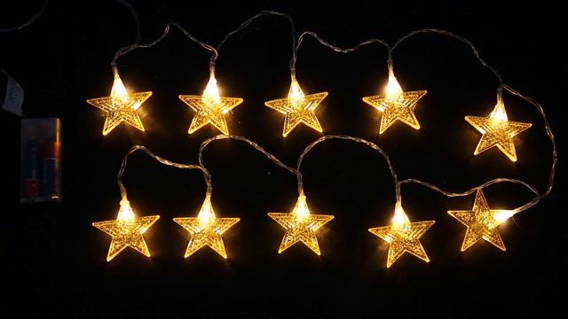 используются только внутри помещения материал: ПВХ, пластмасса, медь, лампы размер: длина гирлянды 165м, длина шнура 30см, 10шт звезд размером 6*6*0,7см, расстояние между звездами 15см кол-во ламп: 10LED цвет шнура: прозрачный работа от батареек: в кол-ве 2шт AA (в комплект не входят) свет: белый теплый упаковка: ПВХ коробка Артикул: 007854
