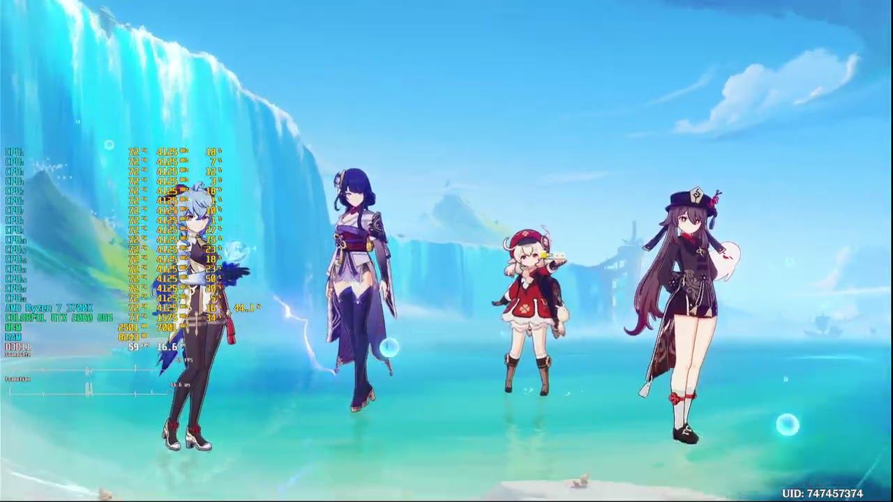 Game: Genshin Impact | Геншин Импакт Сomputer characteristics: Socket: AM4 Motherboard: Asus Prime b450m-a Processor: Ryzen 7 3700X 3.6GHZ Liquid cooling systems: ID-Cooling FROSTFLOW X 360 RAM: KILLSRE 64GB DDR4 DIMM 3200MHZ GPU: COLORFUL RTX 2060 8GB ROM: HDD 500GB+HDD 1TB Video in 1920x1080 resolution. Operating system: Windows 10 Pro