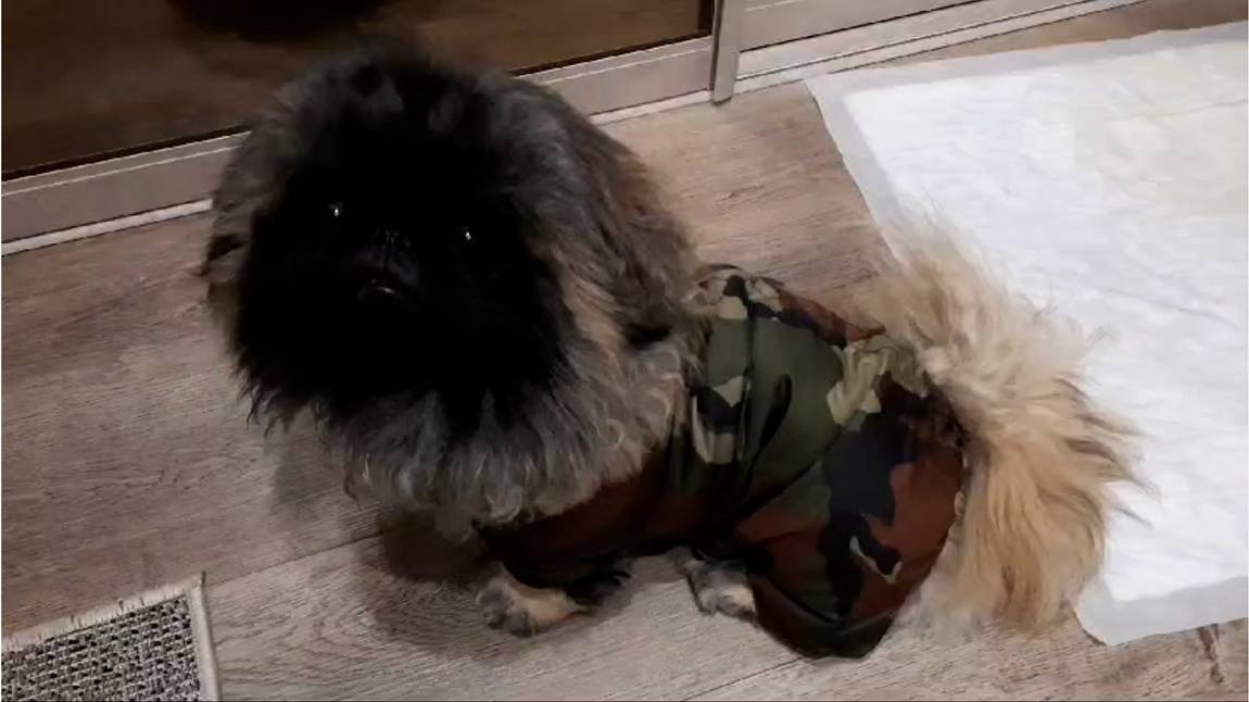 В пасмурную погоду пекинес Дендик одевает курточку