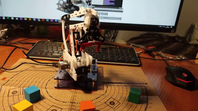 Робот-манипулятор Робоинтеллект. Работает без ардуинки, подключается к компьютеру, можно управлять через программу - пульт, программировать на языке блочного программирования, а еще на Python, C, C++ и других языках. Производитель: https://robointellect.ru/