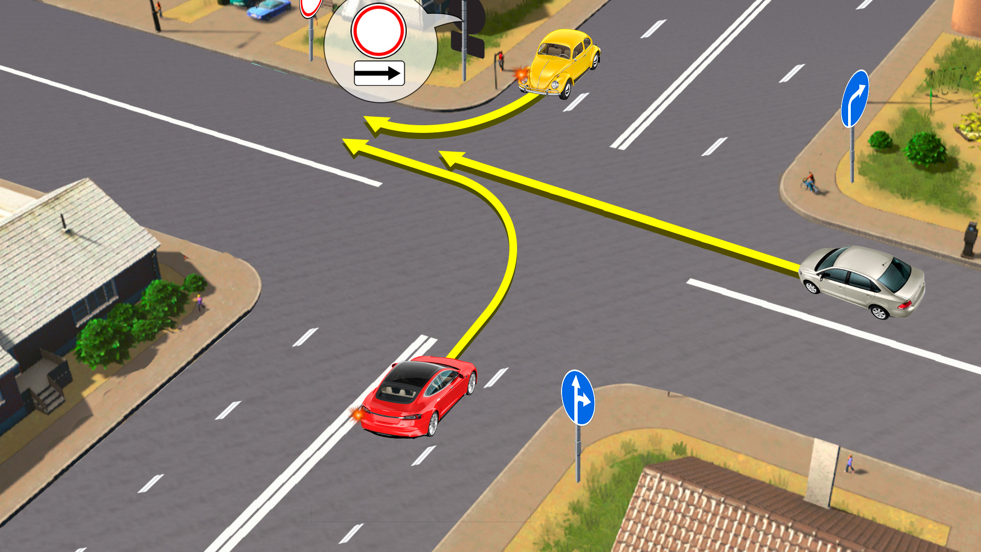 Не все знаки имеют одинаковые исключения. Попробуйте определить разрешенные траектории. Решите эту задачу сами и поделитесь задачей с друзьями. Возможно, им тоже будет интересно.