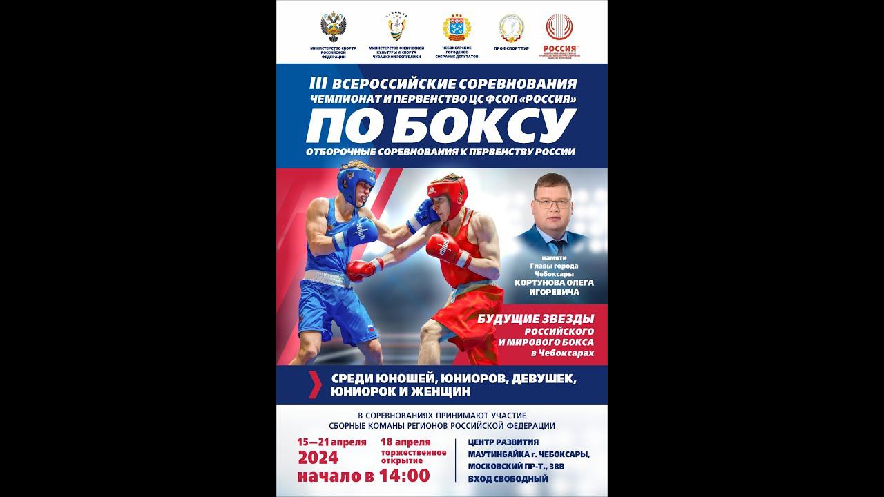 Всероссийские соревнования «Первенство ЦС ФСОП «Россия» по боксу среди юношей 13-14 лет (2010-2011 г.р.)» памяти Главы Города Чебоксары Кортунова Олега Игоревича Подписаться на канал: https://www.youtube.com/c/RussianBoxingFederation/?sub_confirmation=1 Федерация бокса России: http://rusboxing.ru/ ВКонтакте: http://vk.com/rusboxing Телеграм: http://t.me/RussianBoxers Одноклассники: http://ok.ru/group/64339915505917/ Дзен: https://zen.yandex.ru/rusboxing Состав пар 1. 50 кг ТУВАКОВА Светлана Орловская ЦФО - ЯФАРОВА Екатерина Кемеровская СФО ЮН ОШИ 13-14 лет (2010-2011г.р.) 2. 40кг -1гр НОВОКШОНОВ Даниил Ульяновская ПФО - СМИРНОВ Матвей Оренбургская ПФО 3. 40кг -1гр АЗАРОВ Никита Челябинская УФО - ПЫХАНОВ Константин Белгородская ЦФО 4. 40кг -1гр ТРУХИН Даниил Татарстан ПФО - ИВАНОВ Ярослав Удмуртия ПФО 5. 40кг -1гр ТИМИРБАЕВ Марк Московская ЦФО - КУРАНОВ Родион Новосибирская СФО 6. 40кг-2гр ХАМХОЕВ Али Свердловская УФО - АНДРЕЕВ Яким Московская ЦФО 7. 40кг-2гр ШЕКУРЛОВ Парвиз Пермский ПФО - ЛЕМТЮГИН Савелий Ростовская ЮФО 8. 40кг-2гр БОЧКАРЁВ Макар Татарстан ПФО - МАЛИНИН Иван Чувашская ПФО 9. 40кг-2гр ГОНЧАРУК Константин Самарская ПФО - АБЗАЛОВ Артур Татарстан ПФО 10. 42 кг ПЛОТНИКОВ Максим Воронежская ЦФО - КУРБАНОВ Кирилл Свердловская УФО 11. 42 кг ШКАРЫНИН Максим Алтайский СФО - СЕРВАНТЮК Роман Чувашская ПФО 12. 42 кг ВОРОНИН Николай Челябинская УФО - ЕФИМОВ Роман Свердловская УФО 13. 42 кг МЕЗЕНЦЕВ Сергей Иркутская СФО - НИКИФОРОВ Никита Чувашская ПФО 14. 44 кг ГАСОЯН Рушан Свердловская УФО - ВОРОБЬЕВ Арсений Свердловская УФО 15. 44 кг БЕКЕТОВ Сергей Самарская ПФО - УСМАНОВ Эмиль Башкортостан ПФО 16. 44 кг ЗАКИЕВ Равиль Башкортостан ПФО - ЗАМЕТАЕВ Дмитрий Красноярский СФО 17. 44 кг ОВЧАРУК Кирилл Ростовская ЮФО - КОМАРОВ Дмитрий ХМАО-Югра УФО 18. 46 кг КАЮМОВ Адель Татарстан ПФО - МИРОНОВ Матвей Самарская ПФО 19. 46 кг ШИШОКИН Аристарх Чувашская ПФО - КЕРОВ Глеб Пермский ПФО 20. 46 кг ДУДИН Александр Самарская ПФО - КОРАБЛИН Матвей Воронежская ЦФО 21. 46 кг ГАВРИЛОВ Иван Чувашская ПФО - ГАРАЕВ Нахид Воронежская ЦФО 22. 48 кг ГОНЧАРОВ Михаил Оренбургская ПФО - КАРАТЕЕВ Константин Саратовская ПФО 23. 48 кг БЕЛАВИН Вадим Ростовская ЮФО - ИСМАИЛОВ Нурлан Ульяновская ПФО 24. 48 кг ТАРАСОВ Ярослав Нижегородская ПФО - ИСМАИЛОВ Марат Свердловская УФО 25. 48 кг АХМЕТЗАНОВ Камиль Татарстан ПФО - МУСТАФАЕВ Хусейн Удмуртская ПФО 26. 52 кг ПРОКОПЬЕВ Артём Татарстан ПФО - АНТОНОВ Егор Московская ЦФО 27. 52 кг ТИМИРБАЕВ Тимур Московская ЦФО - МУХАМЕТШИН Алан Башкортостан ПФО 28. 52 кг НИЗАМИЕВ Денис Оренбургская ПФО - УСОЯН Константин Самарская ПФО 29. 52 кг КУРАНОВ Матвей Саратовская ПФО - КАМЕНЕВ Сергей Красноярский СФО 30. 57 кг СЛОНИН Егор Забайкальский ДФО - САЛОВ Никита Московская ЦФО 31. 57 кг ЗИЯТДИНОВ Карим Татарстан ПФО - КУЛИКОВ Николай Башкортостан ПФО 32. 57 кг ЕГОРОВ Владислав Татарстан ПФО - ТУПИКОВ Сергей Челябинский УФО 33. 57 кг МАМЕДОВ Махмуд Самарская ПФО - ВЕРШИНИН Егор Томская СФО ТЕХНИЧЕСКИЙ ПЕРЕРЫВ 30 мин 34. 60 кг ГИЛЯЗОВ Кирилл Свердловская УФО - ГОРДЕЕВ Владислав Иркутская СФО 35. 60 кг ХАРИСОВ Егор Чувашская ПФО - ТОРОСЯН Тигран Самарская ПФО 36. 60 кг ТЕМНОХУД Михаил Саратовская ПФО - ВИШНЯКОВ Игорь Саратовская ПФО 37. 60 кг ГЛОНИН Кирилл Татарстан ПФО - ЗВЯГИН Никита Челябинский УФО 38. 63 кг ЧАПАЕВ Дмирий Чувашская ПФО - ВЫСТАВКИН Савелий Коми СЗФО 39. 63 кг БАЙГИЛЬДИН Камал Татарстан ПФО - ДИНЯЕВ Ильяс Самарская ПФО 40. 63 кг ЛЕШУКОВ Кирилл Алтайский СФО - ТОЧЁНОВ Александр Самарская ПФО 41. 63 кг КРАСНОВ Глеб Марий-Эл ПФО - МЕЗЕНЦЕ