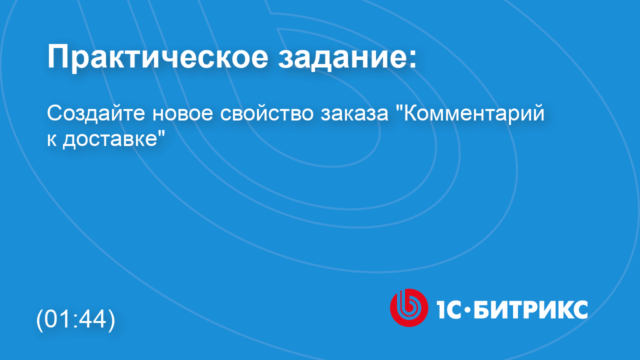 К уроку Практические задания в главе "Настройка магазина": https://dev.1c-bitrix.ru/learning/course/index.php?COURSE_ID=42&LESSON_ID=25170 ** видео без голосового сопровождения Задание № 1: Создайте новое свойство заказа "Комментарий к доставке": 1) Свойство должно распространяться на физических лиц; 2) Группа свойств: Данные для доставки; 3) Мнемонический код: COMMENT; 4) Поле для ввода комментария должно представлять собой окно с несколькими строками.