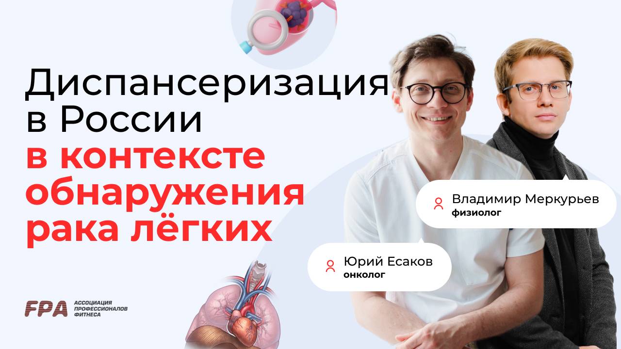 Диспансеризация в России в контексте обнаружения рака лёгкого. Рассказывает онколог Юрий Есаков. Смотрите вебинар «Онкология и фитнес» по ссылке: https://youtu.be/lWGvEa6th5E Эфир ведут торакальный хирург, онколог, заведующий отделением торакальной хирургии Онкоцентра ГКБ имени С. С. Юдина, к. м. н. Юрий Есаков и к. б. н., физиолог, эксперт-преподаватель FPA Владимир Меркурьев. Юрий Есаков: https://www.instagram.com/dr.esakov/ Владимир Меркурьев: https://www.instagram.com/fiziolog_merkuryev/ https://t.me/fiziologmerkuryev __________ Ассоциация Профессионалов Фитнеса (FPA) - лидер на российском рынке фитнес-образования. С 2000 года в FPA сертифицировано более 25 000 специалистов. Наши выпускники работают более чем в 1000 клубах Москвы, России и стран зарубежья 👉 http://fitness-pro.ru/ __________ Дистанционные программы обучения: – Персональный фитнес-тренер: https://bit.ly/39A06Xr – Фитнес-нутрициолог: https://bit.ly/37oC14n — Инструктор групповых программ: https://bit.ly/3AUq3ip – Детский фитнес: https://bit.ly/34OjT4B __________ Очные программы обучения: – Персональный фитнес-тренер: https://bit.ly/2ONTH2K – Инструктор групповых программ: https://bit.ly/2uFh3Re __________ Мы в соцсетях: ВКонтакте: https://vk.com/fpafpa Telegram-канал: https://t.me/trenerskayaFPA Telegram-чат для тренеров: https://t.me/trenerskayaFPAchat Яндекс.Дзен: https://zen.yandex.ru/fitness_pro_ru