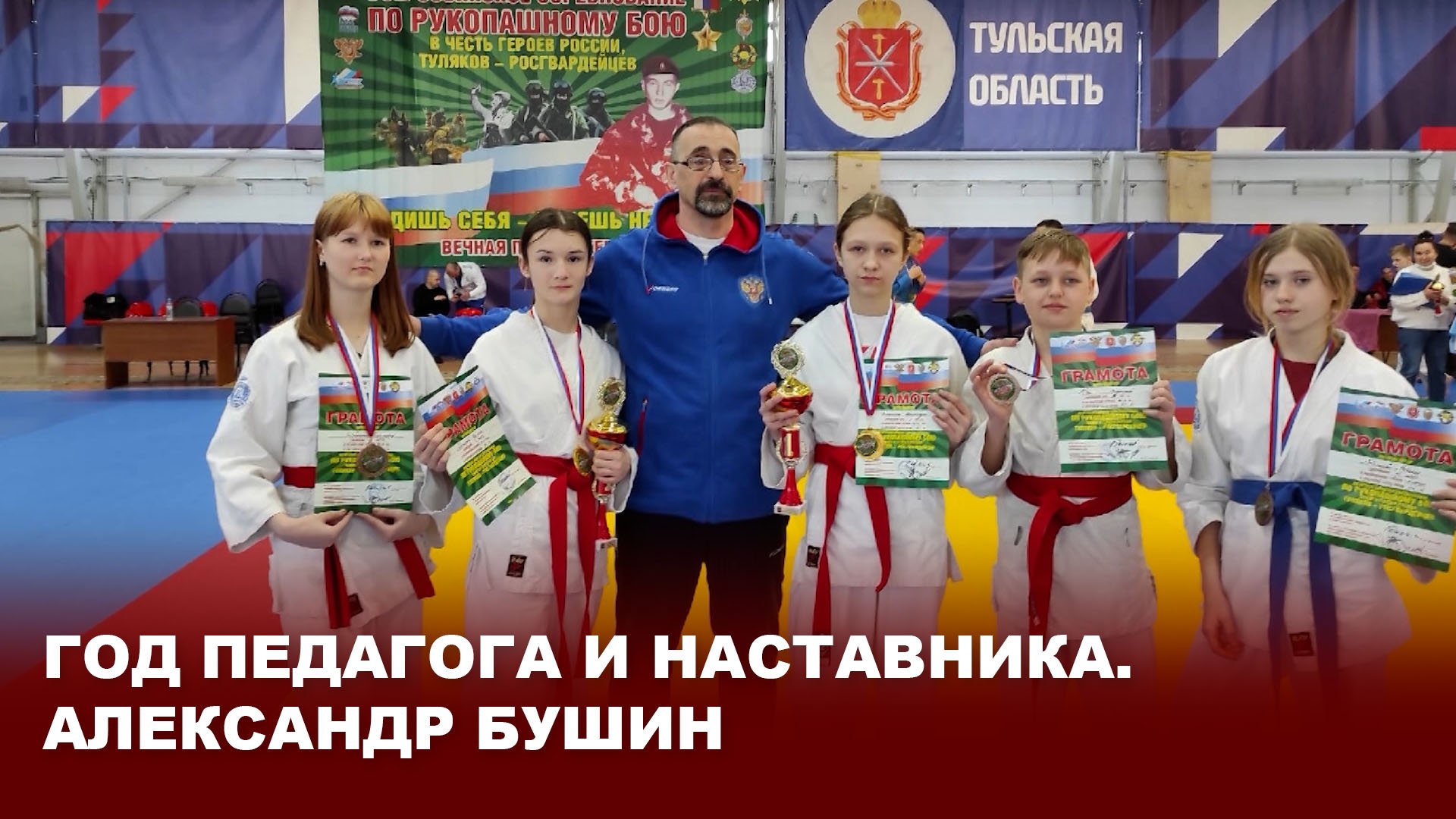 Благодарность главы г. Тулы Ольги Слюсаревой за подготовку спортсменов высокого класса – одна из последних наград тренера-преподавателя Киреевской ДЮСШ Александра Викторовича Бушина, который, являясь мастером спорта по рукопашному бою, уже более 12 лет приобщает к этому виду спорта киреевских мальчишек и девчонок. Они же, добиваясь медалей разного достоинства на соревнованиях самого высокого уровня, продолжают брать пример со своего тренера, который недавно стал ещё и обладателем золотого значка ГТО.