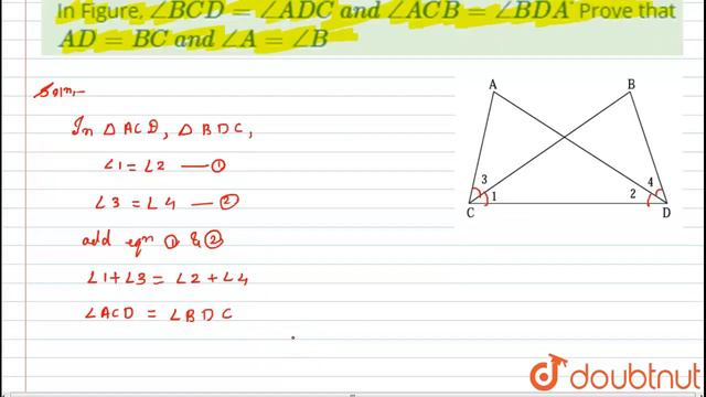 In Figure, /_B C D=/_A D C\\ a n d\\ /_A C B=/_B D Adot\nProve that A D=B C\\ a n d\\ /_A=/_B Class: 9 Subject: MATHS Chapter: CONGRUENT TRIANGLE Board:CBSE You can ask any doubt from class 6-12, JEE, NEET, Teaching, SSC, Defense and Banking exam on Doubtnut App or You can Whatsapp us at - 8400400400 Link - https://doubtnut.app.link/2um0jr7Joeb Join our courses to improve your performance and Clear your concepts from basic for Class 6-12 School and Competitive exams (JEE/NEET) - https://doubtnut.app.link/POyZDvv5Lyb Contact Us: 👉 Have Any Query? Ask Us. 🤙 Call: 01247158250 💬 WhatsApp: 8400400400 📧 Email: info@doubtnut.com 🌐 Website: https://www.doubtnut.com Welcome to Doubtnut. Doubtnut is World’s Biggest Platform for Video Solutions of Physics, Chemistry, Maths and Biology Doubts with over 5 million+ Video Solutions. Doubtnut is a Q&A App for Maths, Physics, Chemistry and Biology (up to JEE Advanced and NEET Level), Where You Can Ask Unlimited Questions by Clicking a Picture of Doubt on the Doubtnut App and Get Instant Video Solution. Subscribe Our YouTube Channels: ✿ Doubtnut: https://www.youtube.com/channel/UCcv7pspGHmM7AOywuLM1ufA?sub_confirmation=1 ✿ Class 11-12, JEE & NEET (Hindi): https://www.youtube.com/channel/UCiIrZf4bn1i0IOf8YgSMzWA?sub_confirmation=1 ✿ Class 11-12, JEE & NEET (English):: https://www.youtube.com/channel/UCbJ_xe2bMLo9yuBC-i_13MQ?sub_confirmation=1 ✿ Class 6-10 (Hindi): https://www.youtube.com/channel/UCZnV1hkn5A3fdpTOVi60tzg?sub_confirmation=1 ✿ Class 6-10 (English): https://www.youtube.com/channel/UC9KeHSWOEBXIrbWYasHeSyg?sub_confirmation=1 ✿ Doubtnut Govt. Exams: https://www.youtube.com/channel/UCWPaROsU_06MSqiZ_O6zaVg?sub_confirmation=1 Follow Us: 🔔 Facebook: https://www.facebook.com/doubtnut 🔔 Instagram: https://www.instagram.com/doubtnut 🔔 Telegram: https://t.me/DoubtnutOfficial 🔔 Twitter: https://twitter.com/DoubtnutApp 🔔 LinkedIn: https://www.linkedin.com/company/doubtnut Our Telegram Pages: 🔔 Doubtnut Official: https://t.me/DoubtnutOfficial 🔔 Doubtnut IIT JEE: https://t.me/DoubtnutIITJEE 🔔 Doubtnut NEET: https://t.me/Doubtnut_NEET 🔔 Doubtnut CBSE Boards: https://t.me/DoubtnutCBSEBoards 🔔 Doubtnut UP Boards: https://t.me/DoubtnutUPBoards 🔔 Doubtnut Bihar Boards: https://t.me/DoubtnutBiharBoards 🔔 Doubtnut Government Exams: https://t.me/DoubtnutGovernmentExams class 9 math class 9 class 9 science class 9 english class 9 ncert class 9 physics class 9 geography sst class 9 class 9 chemistry class 9 history class 9 biology class 9 syllabus cbse cbse class 9 cbse class 9 maths class 9 english grammar class 9 syllabus cbse class 9 science class 9 syllabus maths class 9 syllabus ncert class 9 syllabus science class 9 syllabus english cbse class 9 english cbse class 9 physics cbse class 9 biology class 9 s.s.t syllabus cbse class 9 chemistry class 9 syllabus 2021 cbse class 9 grammar class 9 syllabus of english class 9 syllabus of maths class 9 life science syllabus class 9 syllabus cbse maths class 9 syllabus science ncert class 9 syllabus maths cbse class 9 syllabus for cbse class 9 syllabus maths ncert class 9 syllabus physics