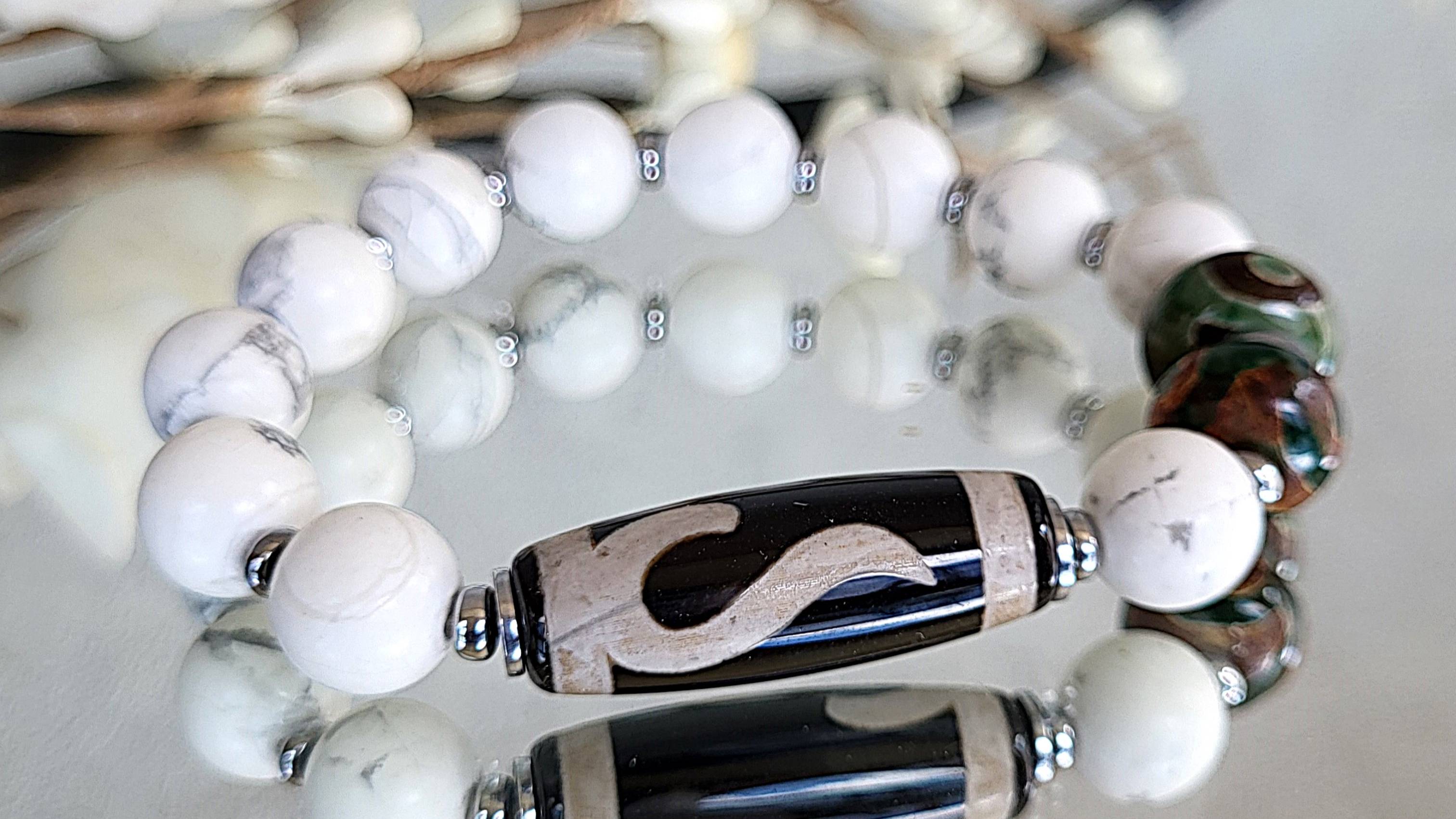Браслет украшения из натуральных камней. Браслет из кахолонга с бусиной ДЗИ РУИ, бусиной ДЗИ трехглазой: кахолонг шарик 10 мм., бусина ДЗИ РУИ (агат) 10х30 мм., ДЗИ (агат) трехглазая 8х12 мм., гематит рондель 1,5х4 мм., шарик 3 мм., длина 18,5 см. на резинке. Возможно изготовление по вашим размерам.