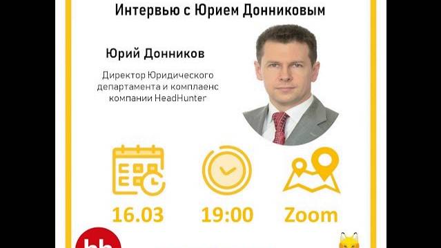 16-го марта (вторник) состоялась пятая лекция курса мастер-классов 'Особенности работы инхаусов. Интервью с Юрием Донниковым.' В рамках этой лекции будут рассмотрены следующие вопросы: 🧩 Структура юридического юридической функции в крупной компании 🎯 Юридическое обеспечение деятельности рекрутинговой компании ⭐ О лекторе: Лекцию будет вести Юрий Донников, Директор Юридического департамента и комплаенс компании HeadHunter. Юрий 14 лет возглавляет юридическую функцию в компании HeadHunter. До прихода в компанию работал в фармакологической компании 'Дельрус'. Юрий специализируется на вопросах управления юридической функции в компаниях, праве интеллектуальной собственности, персональных данных, TMT, выстраивании и автоматизации юридических сервисов, compliance. Таймкоды: 00:00 — Метрики эффективности работы 9:17 — какие метрики эффективности работы не используются 11:23 Принципы работы юридического департамента 17:10 — Автоматизация и цифровизация 20:30 — Какие платформы используются для цифровизации работы 24:15 — Что даёт цифровизация 26:07 — Возвращение с “удалёнки” 28:35 — Compliance 29:31 — С чего начинался комплаенс в HeadHunter 32:05 — Сложности комплаенса 34:17 — Какие сферы деятельности включает в себя комплаенс 34:40 — Управление интеллектуальной собственностью 35:50 — Товарные знаки 38:20 — Патентная работа 40:45 — Претенциозная работа по ИС 44:27 — Блок вопросов 45:40 Что подразумевается под клиентской работой 47:35 — Должны ли сотрудники обладать навыками программирования 49:15 — Какие вызовы стоят перед юридическими службами в современном мире 51:35 — Что можно почитать по теме комплаенса 56:00 — ключевое различие в комплаенсе между российскими и зарубежными компаниями 59:00 — как географически распределены юристы HeadHunter 1:00:10 — Возможности для молодых юристов в HeadHunter 1:01:50 — Какая специализация у юристов HeadHunter 1:05:00 — Напутствие студентам 1:10:50 — Завершение Узнай о работе будущего уже сегодня! 💫
