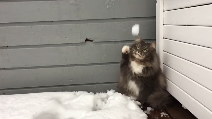 Кошка по имени Нала сначала подсматривает в окошко, а потом играется со снегом.