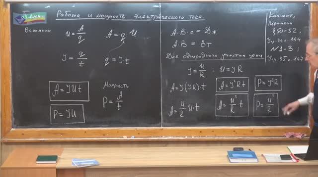 Работа и мощность электрического тока. Домашнее задание: Конспект. По учебнику Пёршкина параграф 50-52, стр.144 упр.34 задачи 1-3, стр.147 упр.35 задачи 1-3. 01:50 Электрическое напряжение - работа электрического поля по перемещению заряда. 03:40 Сила тока - физическая величина равная отношению заряда, протекающего через поперечное сечение проводника, ко времени протекания заряда. 03:50 Электрический Заряд - физическая величина равная произведению силы тока на время протекания. 04:38 Мощность электрического тока. Ваты. 06:50 Закон Ома для Однородного участка цепи. Однородный участок цепи - участок без воздействия сторонних сил. 10:07 Конвертирование величин измерения. 11:37 Электросчётчик. Электроэнергия. Внесистемная единица измерения работы - кВт*ч 14:45 Решение Задач. Это клип - ускоренного в 1,5раза + сжатого в 2раза видео урока, гениального преподавателя физики Павла Андреевича. Оригинал можно найти по ссылке: https://www.youtube.com/@pvictor54 Nelson X
