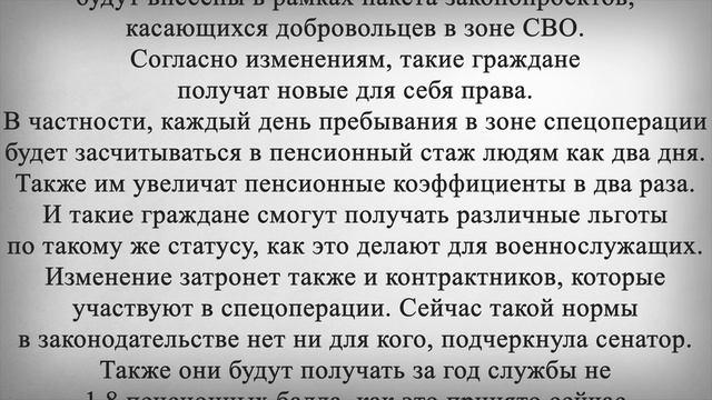 Пенсионные Баллы и Стаж для Пенсии УВЕЛИЧАТ ВДВОЕ! Россиянам рассказали о важном изменении, касающемся системы учета стажа для пенсии. В некоторых случаях один день будет считаться за два. А число пенсионных баллов увеличится вдвое. Об этом рассказала заместитель председателя Комитета Совета Федерации по социальной политике Елена Бибикова. По ее словам, новые изменения в законодательство будут внесены в рамках пакета законопроектов, касающихся добровольцев в зоне СВО. Согласно изменениям, такие граждане получат новые для себя права. В частности, каждый день пребывания в зоне спецоперации будет засчитываться в пенсионный стаж людям как два дня. Также им увеличат пенсионные коэффициенты в два раза. И такие граждане смогут получать различные льготы по такому же статусу, как это делают для военнослужащих. Изменение затронет также и контрактников, которые участвуют в спецоперации. Сейчас такой нормы в законодательстве нет ни для кого, подчеркнула сенатор. Также они будут получать за год службы не 1,8 пенсионных балла, как это принято сейчас для призывников, а в два раза больше. Наконец, по словам Бибиковой, участники СВО смогут выйти на пенсию досрочно в том случае, если они накопят большое количество стажа. Пенсионный возраст им будет снижен на два года, если они смогут подтвердить 42 года стажа. Тогда мужчина сможет выйти на пенсию раньше, но начиная с 60 лет, то есть по старому пенсионному возрасту. Ставьте лайк если считаете, что сейчас необходимо дополнительно повысить пенсии всем пенсионерам и напишите, когда и насколько необходимо повысить пенсии?