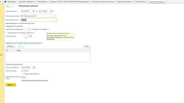 В видео представлена пошаговая инструкция о том, как в программе «1С:Бухгалтерия» подготовить и отправить заявление на получение патента (ПСН) на 2026 год. Основные этапы, показанные в ролике: Настройка программы: Необходимо зайти в раздел «Главное» — «Налоги и отчеты» и в истории изменений добавить запись на январь 2026 года, активировав галочку «Патент». Создание заявления: Рассмотрены два способа доступа к форме заявления: Через раздел «Задачи организации» (система сама напоминает о необходимости подачи). Через раздел «Отчеты» — «1С-Отчетность» — «Уведомления, сообщения и заявления». Заполнение данных: Демонстрируется ввод необходимых сведений: регион регистрации, код вида деятельности, количество сотрудников, наличие льгот и адрес места осуществления деятельности. Отправка: Показано, как отправить заявление в электронном виде через сервис «1С-Отчетность» или подготовить его для подачи на бумаге/через личный кабинет ИП. Также автор напоминает о законодательном сроке подачи заявления — не позднее 10 рабочих дней до начала действия патента (в примере — до 16 декабря 2025 года).