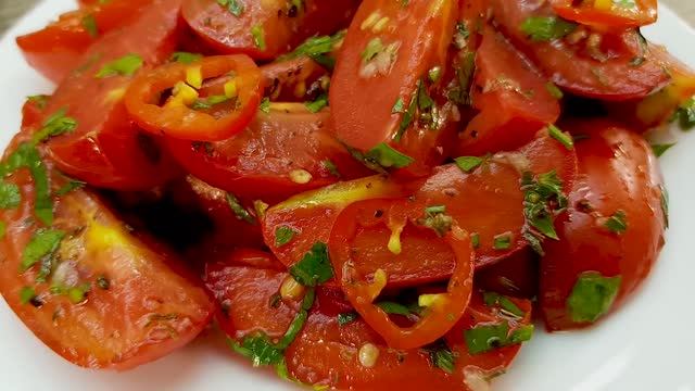 Здравствуйте, уважаемые подписчики и гости моего канала! Моя семья очень любит этот салат. Практически каждый день готовлю, как дополнение к обеду. Готовьте на здоровье! Ингредиенты: 500 г помидор; 1/2 острого перца; небольшой пучок петрушки; 2 зубчика чеснока; 1 ч.л. сахара; 1/2 ч.л. соли; 1 ч.л. орегано; черный перец по вкусу; 1 ст.л. яблочного уксуса; 3 ст.л. оливкового масла; Приятного аппетита! Спасибо что, смотрите👀 наши ролики! Если Вам не сложно, подпишитесь🔊 на наш канал, нам будет приятно! Если Вам понравился рецепт, поставьте 💘,сделайте репост;) Для развития канала,поддержите нас пожалуйста🙏 небольшой суммой в размере 10 руб.💲. Вам мелочь, а нам приятно.🌹