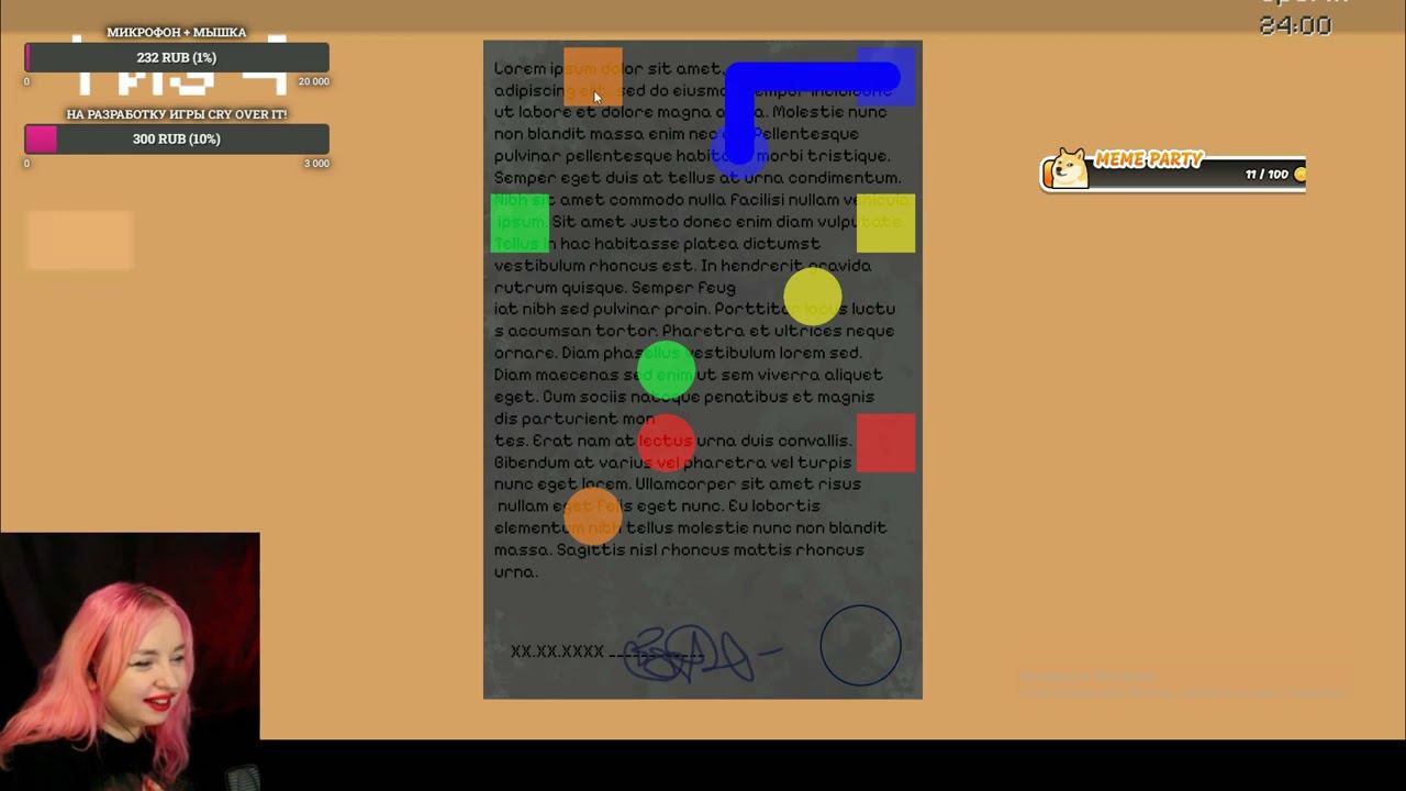 Игра моей команды https://kate-black.itch.io/cry-over-it После джема мы решили доделать нашу игру и выпустить её в стим. Вы можете поддержать нас в этом не лёгком деле и помочь нам монеткой https://www.donationalerts.com/r/kate_blackkk Полезные ссылки Twitch https://www.twitch.tv/kate_blackkk Telegram https://t.me/novosty_svinery Discord https://discord.com/invite/qksnaaSxr6 TikTok https://www.tiktok.com/@kate_blackkkk Instagram https://www.instagram.com/kate_blackkkk/ ArtStation https://www.artstation.com/kateblackkk Itch.io https://kate-black.itch.io/ Donationalerts https://www.donationalerts.com/r/kate_blackkk Таймкоды 00:00:00 Начало 00:01:36 Я (не) свободна 00:16:00 No time to live 00:23:08 Amend the time 00:35:23 Office mouse 00:41:14 The time has fallen 00:50:03 Mices saver 00:57:52 CyberCheese 01:02:59 Mice of P 01:11:10 Mouse May Cry 01:25:39 заключительное слово