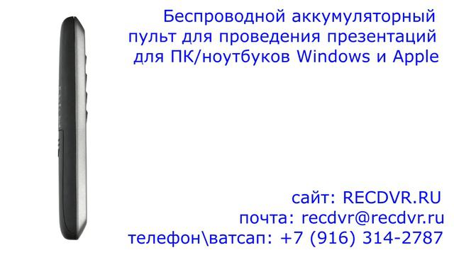 https://recdvr.ru/product/besprovodnoj-akkumuljatornyj-prezenter-dlja-windows-i-apple/ - Беспроводной аккумуляторный презентер для Windows и Apple с доставкой по Москве и всей России. Наш телефон в Москве: +7 (916) 314 2787. Предлагаем вашему вниманию беспроводной пульт для проведения презентаций на устройствах под управлением операционных систем Windows и Mac. Данный презентер работает по радиоканалу на частоте 2,4 ГГц на расстоянии до 30 метров от того оборудования, на котором необходимо показывать слайды. Устройство передаёт все наши команды, когда мы нажимаем на нём на кнопки, на крошечный USB ресивер, который необходимо подключить в соответствующий порт в компьютере. Девайс работает от двух батареек AAA и выполнен в чёрном цвете с весом всего лишь 42 грамма. Функционал гаджета дополнен встроенной лазерной указкой красного цвета. Технические характеристики Способ работы: радиоканальный Рабочая частота: 2,4 ГГц Радиус действия: 30 м Интерфейс юсб ресивера: USB Совместимость: ОС Windows и Apple MAC Функция лазерной указки: есть Цвет лазерного луча: красный Количество кнопок: 6 Кнопки: полноэкранный режим, листание вверх, листание вниз, лазерная указка, переключение систем, включение/выключение Питание: 2 батарейки AAA Индикатор заряда батареи: есть Материал: пластик Цвет:черный Размеры (ШхВхГ): 28 х 139 х 18 мм Вес: 42 грамм Комплектация устройство для презентаций, юсб модуль, документация, упаковка.