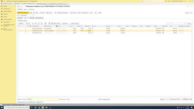 Общий объем и вес товаров в реализациях для 1С