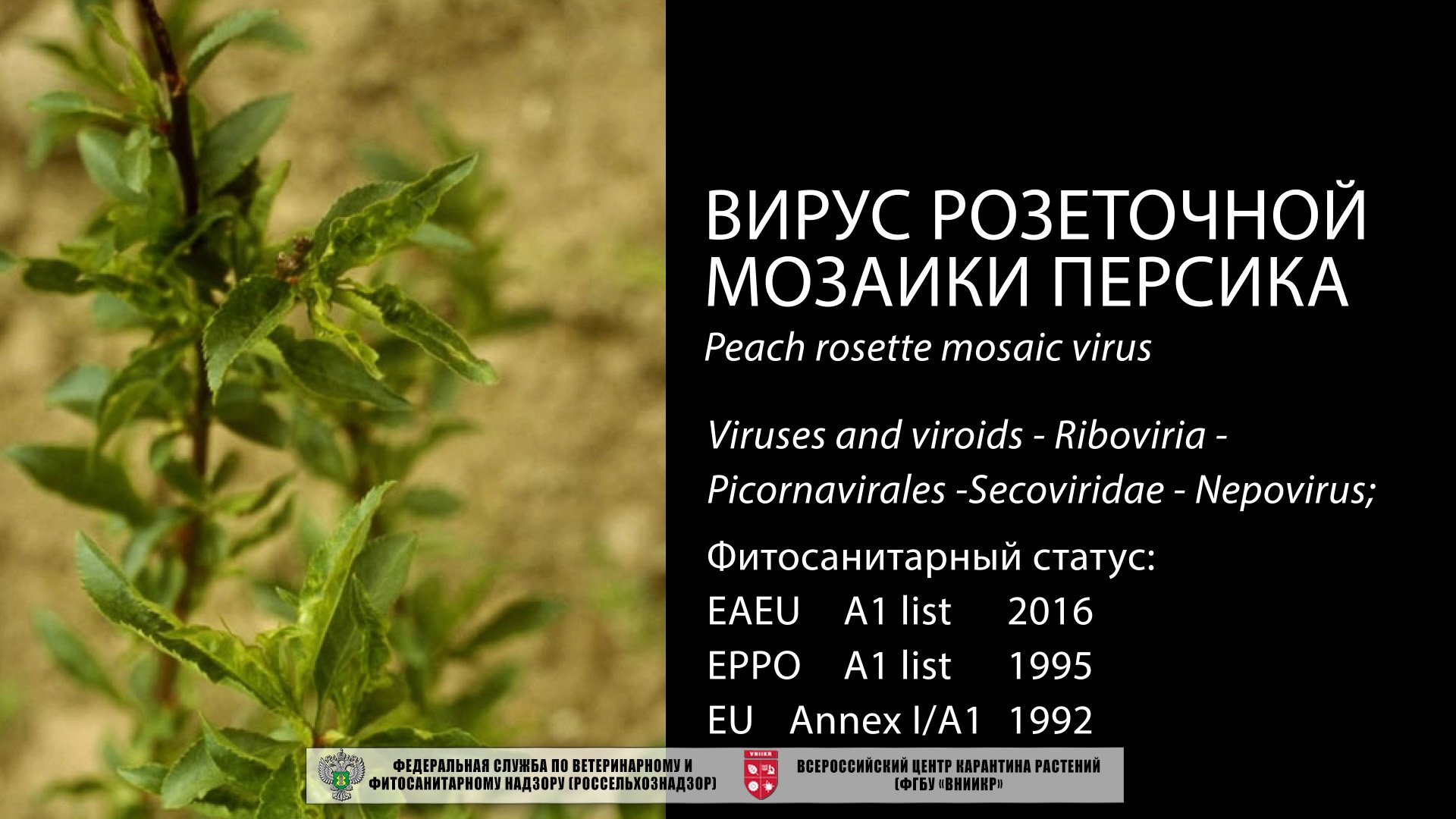 Неповирус розеточной мозаики персика (Peach rosette mosaic virus) повреждает растения винограда и персика. Хозяевами патогена также могут быть: паслён каролинский, одуванчик лекарственный, щавель курчавый, голубика