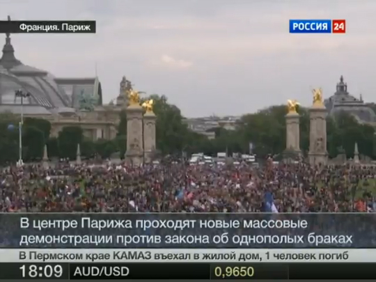В массовой манифестации против легализации однополых браков, прошедшей в Париже, участвовали около 150 тысяч. Акция прошла относительно мирно, однако французская полиция была приведена в состояние повышенной готовности. В преддверии демонстрации были арестованы около 50 человек, перекрывшие Елисейские поля, одну из главных улиц в центре Парижа. Это первая крупная акция протеста после того, как президент Франции Франсуа Олланд 18 мая Нажать подписал закон об однополых браках, разрешающий, в числе прочего, однополым парам усыновлять детей.