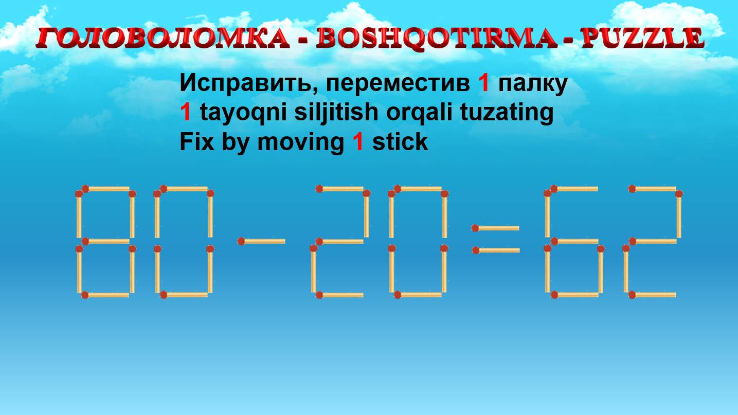 ГОЛОВОЛОМКА - BOSHQOTIRMA – PUZZLE. Спичка. 80-20=62, 59-38=30, 85-25=36, 63-26=30