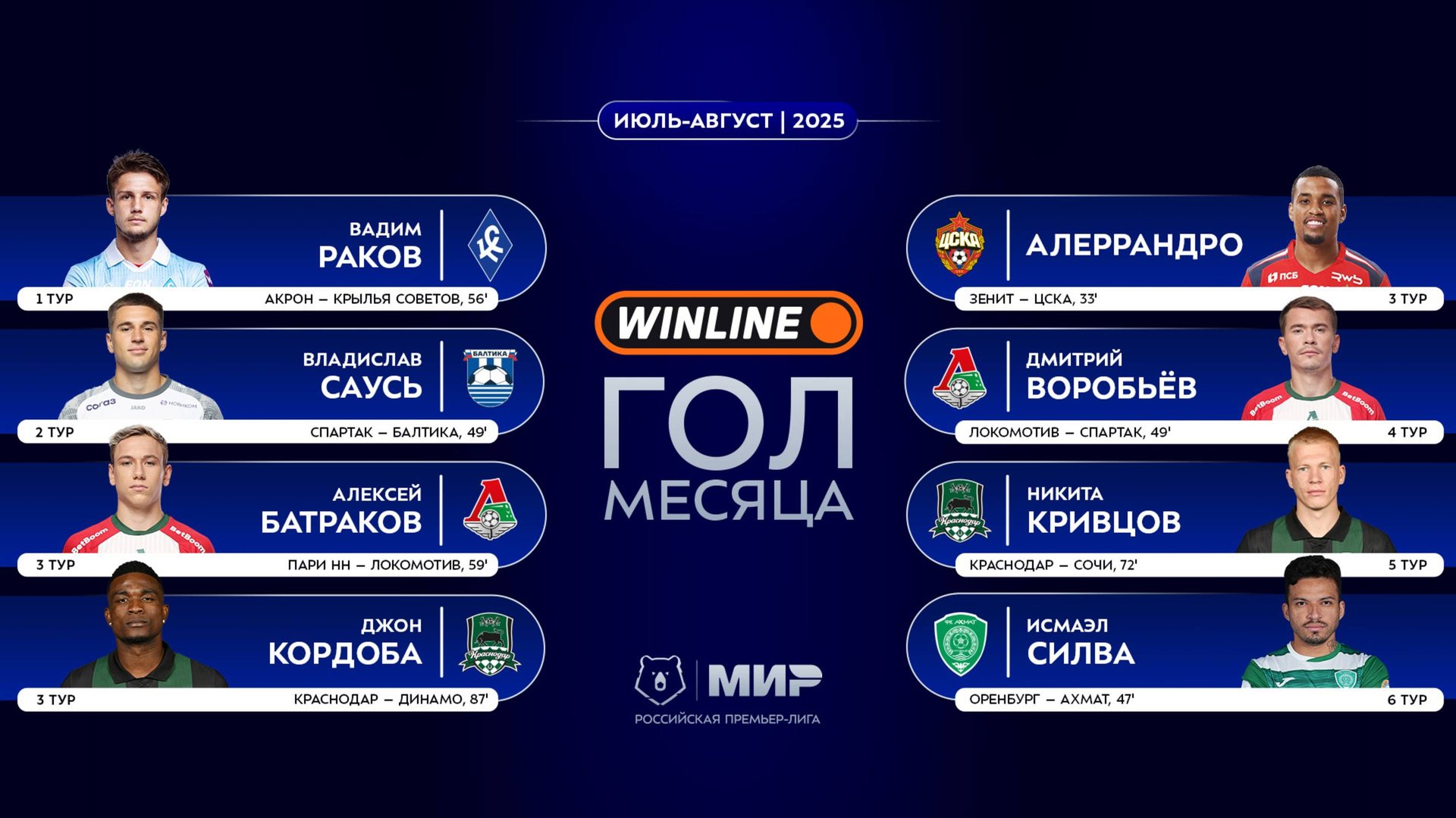 Winline гол месяца | Июль – август 2025 | Кандидаты