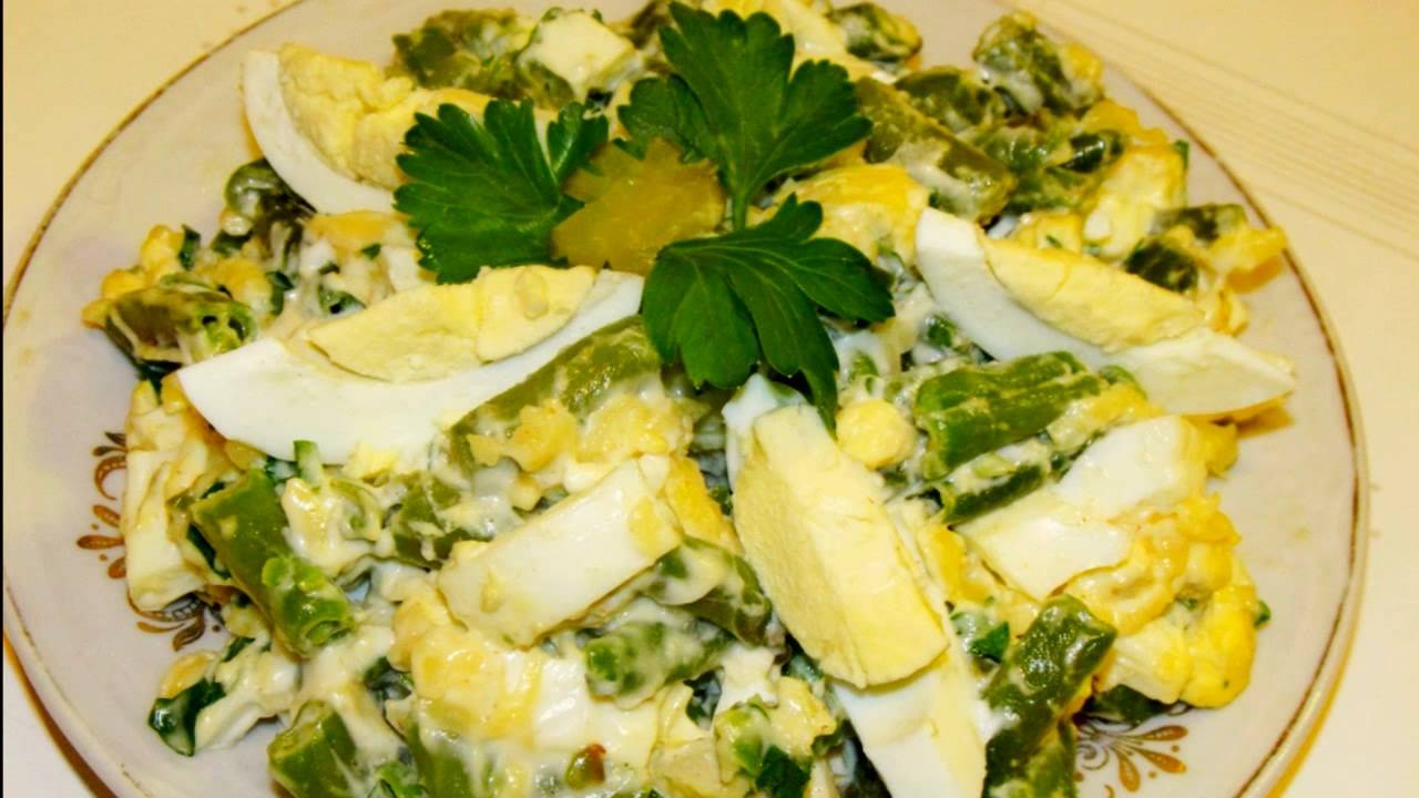В этот салат при желании можно добавить огурец, к примеру, придать ему свежих ноток. И зелень разнообразить, новый вкус получится. Вариантов много. Рецепт: Стручковая зелёная фасоль - 400 гр Яйца - 4 шт Чеснок - 1 зубчик Сыр - 50 гр Масло сливочное - 40 гр Масло растительное - 1 ст.л Майонез - 4 -5 ст.л Петрушка - 1 пучок Салатная приправа ( у меня с пармезаном) - 1ч.л