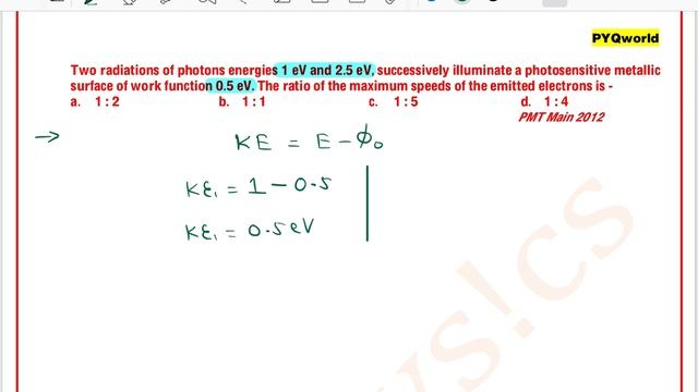 Two radiations of photons energies 1 eV and 2.5 eV, successively illuminate a photosensitive metallic surface of work function 0.5 eV. The ratio of the maximum speeds of the emitted electrons is -