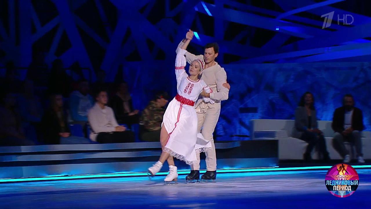 На льду – актриса и режиссер Надежда Михалкова и олимпийский чемпион Максим Маринин. Они катаются под народную песню «Реченька» в исполнении Жени Рябцевой и коллектива «Gurude».